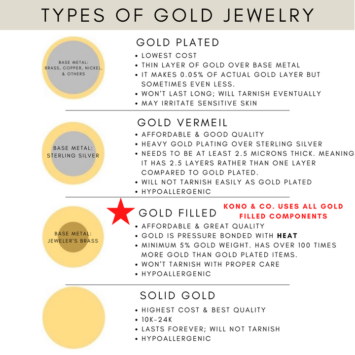 Using all Gold Filled pieces to ensure your jewelry lasts you on your every day adventures. The core is a jeweler's brass and has real solid gold pressure bonded around it. It has a permanent bond. Unlike gold plated jewelry, gold filled will not chip away. It has 100 times more gold than gold plated.